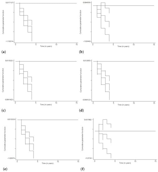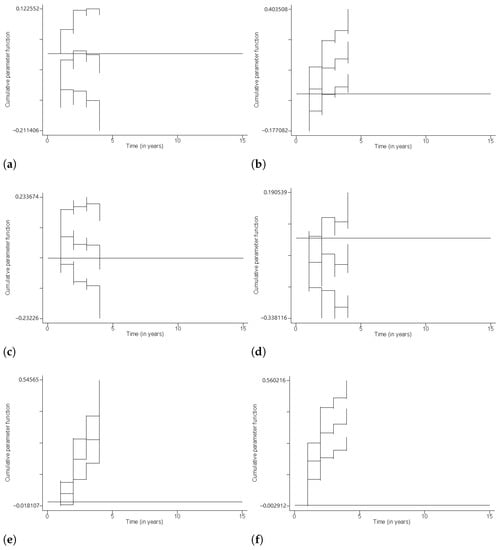 Figure 4 gives the plots of the cumulative parameter functions and their 95% confidence limits for levels of the variable Region. The cumulative parameter functions with their 95% confidence limits are negative for levels South America (Figure 4a), North America (Figure 4c), Europe (Figure 4d) and Asia (Figure 4e). The pattern for level Oceania is negative together with the major parts of its confidence limits (Figure 4b). This suggests a relatively higher risk of cryptocurrencies of the referral region. The pattern for level Africa (Figure 4f) oscillates around the zero line, and the plot of 95% confidence limits are on either sides of the zero line. This indicates that the slope may be zero at some time value, and the risk of African cryptocurrencies may not be significantly different from that of the referral region.