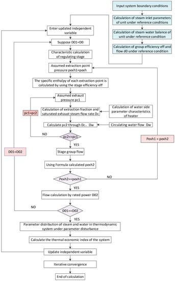 When the unit is disturbed by factors, the parameters causing the change of working conditions are substituted into the calculation model, according to the characteristic model of flow passage, characteristic model of heater and characteristic model of condenser, calculate the variation of steam extraction at all levels. Determine the system state parameters synchronously. Parameter coupling is fully considered in the model’s construction, and three-layer iterative logic is adopted in the algorithm design of the model. A mechanism analysis of the condenser’s heat transfer characteristics, the Flugel formula and power balance equation are used as the constraint for the end of the iterative calculation of exhaust pressure, the extraction pressure at each extraction point and the main steam flow. Through the model design of the three-layer iterative cycle mode, the extraction coefficient and condensation coefficient can be used as the coupling point; synchronous iterative calculations of exhaust flow, exhaust pressure and exhaust enthalpy are realized; and the mechanisms of the coupling relationships between various parameters can be analyzed. The corrected values of all steam and water parameters of the system and the flow of groups at all levels after parameter disturbance are thereby obtained.