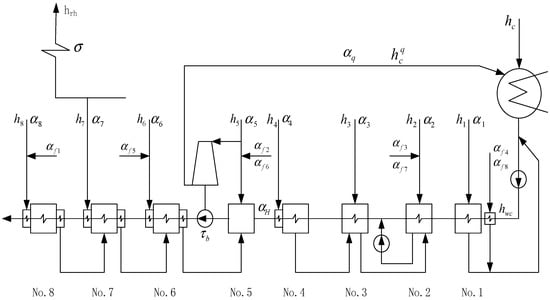 For any stage heater in the thermal system, the outlet water temperature , the specific enthalpy , the inlet water temperature and the inlet water specific enthalpy can be calculated in the following order: