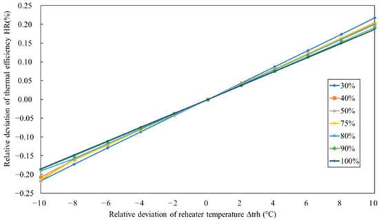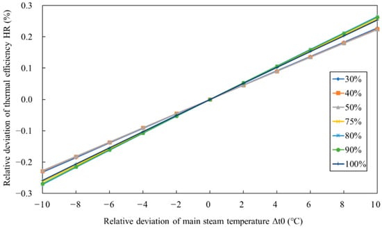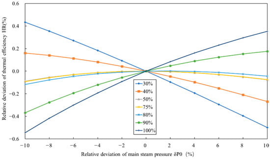 Figure 8 shows the variation in the relative deviation of thermal efficiency with a disturbance in the high-pressure cylinder efficiency under different output power loads. For a unit at its rated load, the unit thermal efficiency increases with the increase in high-pressure cylinder efficiency: if the high-pressure cylinder efficiency increases by 6%, then the unit thermal efficiency increases by 0.836%, or if the high-pressure cylinder efficiency decreases by 6%, then the unit thermal efficiency decreases by 0.846%.