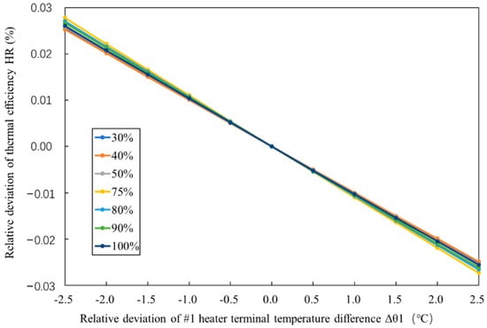 Variation in the relative deviation of thermal efficiency with #1 heater terminal temperature difference disturbance under different output power loads.