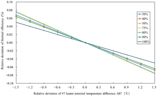 Variation in the relative deviation of thermal efficiency with #7 heater terminal temperature difference disturbance under different output power loads.