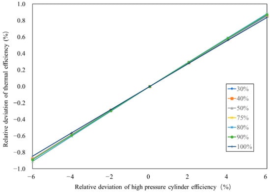 Variation in the relative deviation of thermal efficiency with high-pressure cylinder efficiency disturbance under different output power loads.