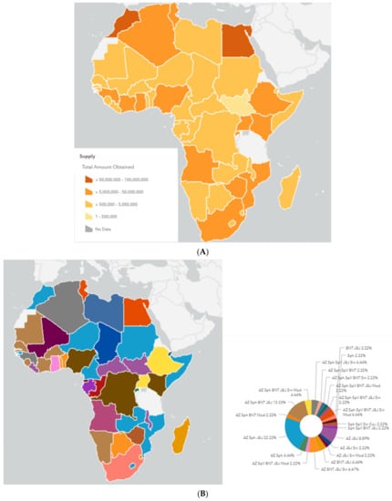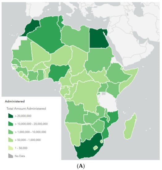 We generated Figure 1, Figure 2 and Figure 3 to demonstrate the vaccination distribution and coverage through all the continent in order to be able to visualize the details of the early responses. The figures were generated through the data published in Africa CDC vaccination dashboard as well as Oxford’s project -our world in data-. We applied the appropriate filters needed to get the required graphs representing the African continent [34,35].