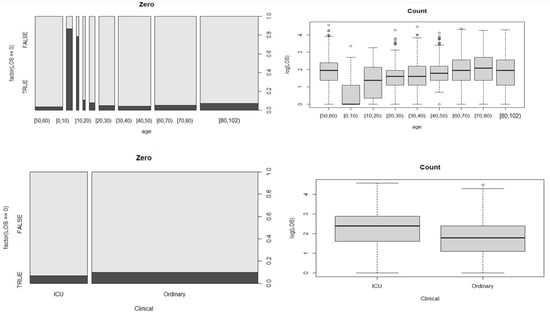 Figure 3 shows the variation in LoS for each predictor. In Figure 4, the plots of LoS = = 0 (true) vs. LoS > 0 (false) are displayed for each predictor. True values (in black) indicate that zeros are infrequent except for the age groups [0, 10) and [10, 20). False values (in white) indicate that LoS values greater than zero are more frequent, and these are shown in the count boxplot for each predictor.