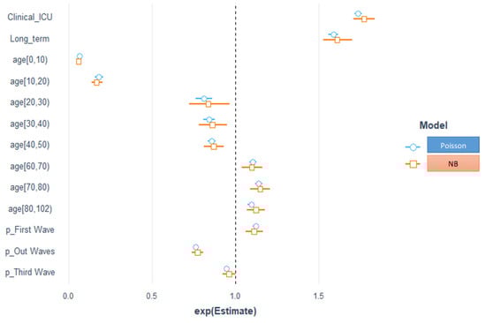 Interpretation (Hurdle–NB, positive count model or truncated Poisson) (see Table 6): Given the positive response (among those with positive counts), the average count was 6.72. The average LoS increased by 1.84-fold in the ICU setting compared with ordinary hospitalization and low-intensity stays among those with positive counts. The average LoS increased in the age groups of [60, 70), [70, 80), and 80+ by 1.12-, 1.19-, and 1.19-fold, respectively, and decreased by 0.29-, 0.64-, 0.88-, and 0.87-fold in the age groups of [0, 10), [10, 20), [30, 40), and [40, 50), respectively, whereas the age group of [20, 30) did not have a significant effect on the average LoS of those who had positive counts or a LoS greater than 0, all compared with the [50, 60) age group. The average LoS increased by 1.58-fold in long-term stays compared with regular hospitalization among those with positive counts. The average LoS increased by 1.21-fold during the first wave and decreased during the third wave and out waves by 0.95 and 0.84 times, respectively, for those with positive counts, compared with the second wave (chosen as the reference level). The exponentials of the coefficients or estimates for the Poisson model and NB model, and the Hurdle–NB model for count and zero Hurdle effect plots are shown in Figure 6.