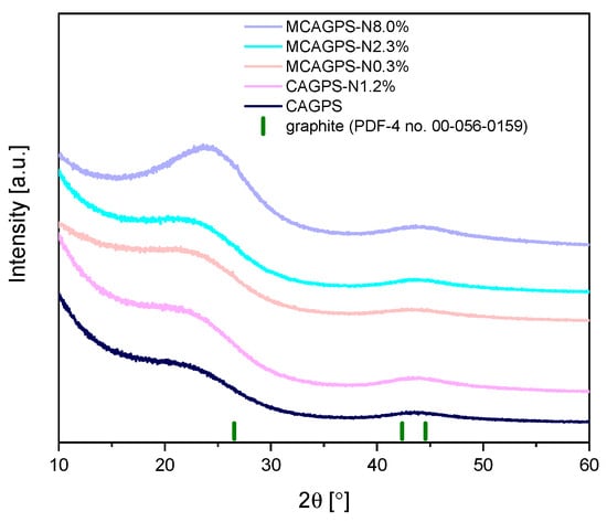 XRD patterns of nitrogen-doped and pristine carbon aerogels over the 2θ range of 10–60° (MCAGPS—carbon aerogel made from potato starch modified with melamine; CAGPS-N—carbon aerogel made from potato starch modified by N2 pyrolysis; CAGPS—pristine carbon aerogel).