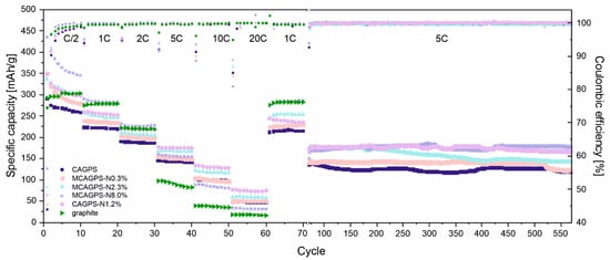 The nitrogen-doped carbon aerogel materials, as well as the pristine ones (CAGPS), were subjected to galvanostatic charge–discharge tests in a half-cell system. All studied carbons were tested at room temperature (Figure 2 and Figure 3), performing 7 sets of 10 cycles in sequence using currents equivalent to C/2, 1C (0.35 A/g), 2C, 5C, 10C, 20C, 1C (in reference to graphite); then, an additional 500 cycles under 5C current rate were performed (excluding graphite due to its bad performance under higher current load).