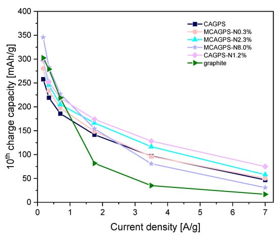 Charge capacity of every 10th cycle as a function of current density (MCAGPS—carbon aerogel made from potato starch modified with melamine; CAGPS-N—carbon aerogel made from potato starch modified by N2 pyrolysis; CAGPS—pristine carbon aerogel).