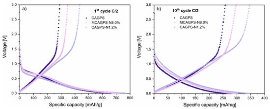 Charge–discharge voltage profiles for the (a) 1st and (b) 10th cycle of CAGPS-, CAGPS-N1.2%-, and MCAGPS-N8.0%-based electrodes at C/2 current rate (MCAGPS—carbon aerogel made from potato starch modified with melamine; CAGPS-N—carbon aerogel made from potato starch modified by N2 pyrolysis; CAGPS—pristine carbon aerogel).
