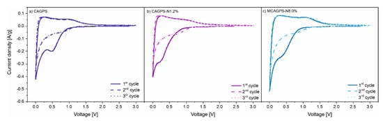 Cyclic voltammetry curves (measured at a scan rate of 0.1 mV/s) of CAGPS, CAGPS-N1.2%, and MCAGPS-N8.0% are presented in Figure 5. Voltammograms of all samples show a broad cathodic peak, visible only during the first cycle, which corresponds to the formation of a passivation layer on the anode materials surface. Analyzed samples present a significant change in the potential of SEI layer formation, assuming values of 0.47 V, 0.26 V, and 0.17 V for CAGPS, MCAGPS-N8.0%, and CAGPS-N1.2%, respectively. This implies a different structure of the SEI layer and can also be a reason for differences in performance during galvanostatic cycling. As is commonly known for graphite, the first cycle of lithiation may be divided into several continuous transitions (from LiC72 to LiC6), during which the voltage of distinct reaction between delithiated and fully lithiated carbon varies in the range of 0.01 V to 1.50 V. The irreversible capacity of first discharge above 0.25 V is attributed to the reactions, which take place before the beginning of intercalation. Reactions occurring between 0.25 V and 0.04 V are connected with the formation of a solid electrolyte interface during the lithiation of graphite []. Voltammetry measurements show that the passive layer formation of reference carbon (CAGPS) takes place at higher potentials. After introducing nitrogen into the structure, doped material seem to be less sensitive to side reactions before the first lithiation. As mentioned above, the slight increase of coulombic efficiency in the initial cycle after doping (43.95% for CAGPS, 48.40% for CAGPS-N1.2%, and 56.43% for MCAGPS-N8.0%) can be connected with the partial suppression of the side reactions of the material on the contact surface with the liquid electrolyte.