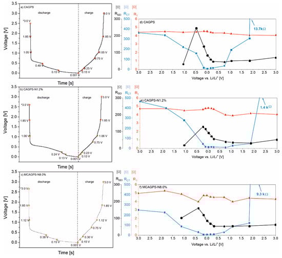 Voltage profiles of (a) CAGPS, (b) CAGPS-N1.2%, and (c) MCAGPS-N8.0% materials with marked potentials, in which electrochemical impedance spectroscopy (EIS) measurements were carried out. The values of R1, RSEI, and RCT as functions of potential for (d) CAGPS, (e) CAGPS-N1.2%, and (f) MCAGPS-N8.0%, respectively ((MCAGPS—carbon aerogel made from potato starch modified with melamine; CAGPS-N—carbon aerogel made from potato starch modified by N2 pyrolysis; CAGPS—pristine carbon aerogel).