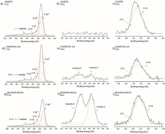 The X-ray photoelectron spectra of investigated (a–c) CAGPS, (d–f) CAGPS-N1.2%, and (g–i) MCAGPS-N8.0% materials (MCAGPS—carbon aerogel made from potato starch modified with melamine; CAGPS-N—carbon aerogel made from potato starch modified by N2 pyrolysis; CAGPS—pristine carbon aerogel).