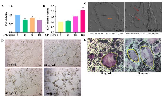 Effect of OPG on survival rate and cell membrane integrity of osteoclasts. (A) Cell viability was analyzed by CCK-8. (B) LDH release was examined by ELISA. (C) SEM was used to observe the morphology of osteoclasts; magnification is 500 ×. (D) osteoclasts’ morphology was observed by microscope; scale bar =100 μm. (E)—Mature osteoclasts were stained with TRAP; scale bar = 50 μm. (mean ± SD, n = 3, * p < 0.05, ** p < 0.01).