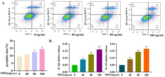 Flow cytometry was used to detect the pyroptosis rate of osteoclasts. After different concentrations of OPG treatment for 12 h, the osteoclast was stained with PI and FITC; in this experiment, if osteoclasts were double-stained, they were mainly distributed in the Q2 quadrant and were defined as having pyroptosis. Therefore, as shown in Figure 2A, the pyroptosis rate of osteoclasts significantly increased with increasing OPG concentration, compared to the control group, but OPG (40 ng/mL) had no significant effect on the pyroptosis rate of osteoclasts. These results indicated that OPG could induce pyroptosis of osteoclasts. As shown in Figure 2B, after treatment with OPG (0, 40, 80, 100 ng/mL) for 12 h, compared with the control group, the contents of IL-1β and IL-18 in the culture supernatant were increased. The results revealed that OPG promotes the release of inflammatory factors in osteoclasts.