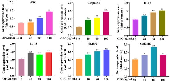 After treating osteoclasts with OPG at different concentrations (0, 40, 80, and 100 ng/mL) for 12 h, qRT-PCR was used to detect the transcription levels of pyroptosis-related genes (ASC, caspase-l, GSDMD, NLRP3, IL-18, and IL-1β). As shown in Figure 3, the results showed that the m-RNA transcription level of ASC was not significantly different from that of the control group under 40 ng/mL OPG treatment but significantly increased after 80 ng/mL and 100 ng/mL OPG treatment. Compared with the control group, the m-RNA transcription levels of caspase-l, GSDMD, NLRP3, IL-18, and IL-1β were significantly increased under 40, 80, and 100 ng/mL OPG treatment. These results showed that OPG increased the expression levels of pyroptosis-related genes.