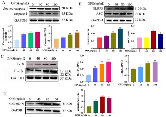 As shown in Figure 4A,B, after 12 h treatment of osteoclasts with OPG at different concentrations (0, 40, 80, 100 ng/mL), protein expression levels of caspase-l, cleaved caspase-l, NLRP3, and ASC were significantly increased with increasing OPG concentration compared with the control group. As shown in Figure 4C, compared with the control group, the protein expression of inflammatory factors IL-1β, and IL-18 were also obviously increased with the increase in OPG concentration. As shown in Figure 4D, the expression of GSDMD-N was increased compared with the control group. Their results indicate that OPG increases the expression of pyroptosis proteins on osteoclasts.