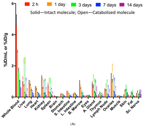 As the MMAE radioactivity decreased from the systemic circulation, it was distributed to various tissues. The MMAE was quickly distributed to multiple organs, such as the liver, lungs, and kidneys within 10 min post IV administration. There is a large tissue partitioning in these highly perfused tissues as radioactivity detected in these tissues was greater than 1 %ID/g, a more than 15-fold higher level than detected in the whole blood. In contrast to the highly perfused tissues, there was little radioactivity detected in the brain (0.00738 ± 0.000937 %ID/g at 10-min post-dose). The radioactivity level peaked at 10 min in most tissues; however, the exposure of unconjugated MMAE in tissues could only be maintained for a short period as the radioactivity was barely detectable by 144 h (Figure 2B).