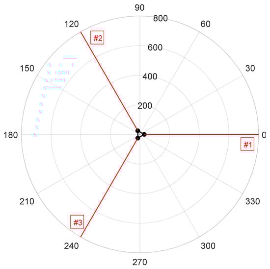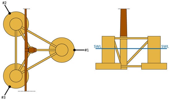 The reference tri-floater support structure, assumed in the subsequent benchmark study, is the OC4-DeepCWind platform [], equipped with the 5 MW NREL wind turbine []. It is equipped with three mooring lines, spread 120° apart, as depicted in Figure 1.