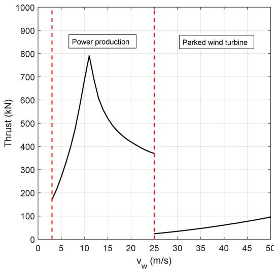 The OC4-DeepCwind platform [] consists of a tri-floater support structure, equipped with the NREL 5 MW wind turbine []. It has three offset columns, connected to each other by two sets of bracings and consisting of an upper and a base cylinder, the latter with an enlarged diameter to suppress, as far as possible, the heave motion of the FOWT. The tri-floater is also equipped with a central main column that supports the tower of the wind turbine and is connected to the offset columns by an additional set of bracings. The main properties of the FOWT are listed in Table 1, while the thrust curve of the wind turbine is provided in Figure 2, as a function of the wind speed at hub height, for both power production and parked wind turbine conditions [,]. In this respect, it must be pointed out that the rotor control mechanism of the wind turbine was not considered here. Anyway, it is expected that this assumption does not significantly affect the analysis performed in Section 6. In fact, Barrera et al. [] recently carried out a comparative analysis on the stress histories in the mooring lines of the OC4-DeepCWind platform, modelling the wind forces by a look-up table of thrust coefficients and by the blade element momentum theory, including, in the latter case, the rotor control mechanism of the wind turbine. They verified that the agreement between the different numerical approaches and the experimental results was always very good. The response amplitude operators (RAOs) due to first-order wave loads and the second-order difference-frequency quadratic transfer functions (QTFs) of the OC4-DeepCWind platform are listed in Appendix B.