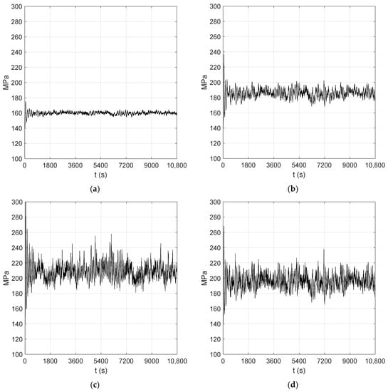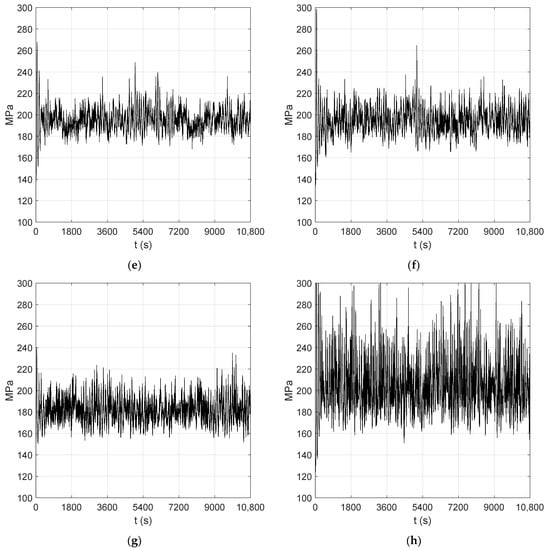The stress process in mooring line#1, corresponding to a typical 3 h storm duration, is plotted in Figure 6a–h, with a sampling frequency of 5 Hz. As can be gathered from the relevant stress histories, the standard deviation of the stress process increased along with the sea state severity. In this respect, the load conditions from LC1 to LC6, which refer to the power production mode, were clearly dominated by the low-frequency component of the stress process, while the low- and wave-frequency components of the stress process were comparable in the last two conditions, which refer to the parked wind turbine situation. These outcomes will be further investigated by the fatigue analysis, performed in Section 6.2 and Section 6.3, by the time-domain and spectral models, respectively.