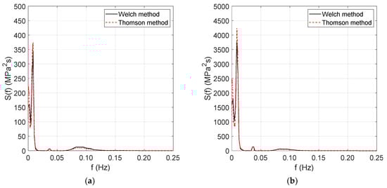 The spectra of the stress process in mooring line #1, determined by Welch and Thomson methods, are plotted in Figure 7a–h using black continuous and red dashed lines, respectively. In all cases, the separation frequency was set equal to 0.05 Hz. In addition, the low- and wave-frequency components of the stress process were clearly detectable. The former is due to the combined action of the slowly varying drift forces and the turbulent component of the wind forces; the latter, instead, is related to the first-order wave forces. The cumulative fatigue damage per unit time and the relevant fatigue parameters required by the combined spectrum method are reported in Table 5 and Table 6. By a comparative analysis between the cumulative fatigue damage provided by the Welch and Thomson methods, the two spectral analysis techniques provide comparable results, in terms of standard deviations and up-crossing rates of both low- and wave-frequency components of the stress process in the mooring line #1. Further details are provided in Section 7.