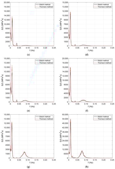 Spectra of the stress history in line #1. (a) Load condition LC1; (b) load condition LC2; (c) load condition LC3; (d) load condition LC4; (e) load condition LC5; (f) load condition LC6; (g) load condition LC7; (h) load condition LC8.