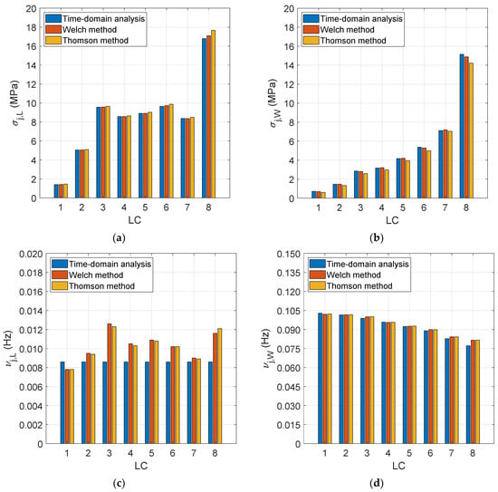 Comparative analysis between time- and frequency-domain models. (a) Standard deviation of the low-frequency stress component; (b) standard deviation of the wave-frequency stress component; (c) up-crossing rate of the low-frequency stress component; (d) up-crossing rate of the wave-frequency stress component.