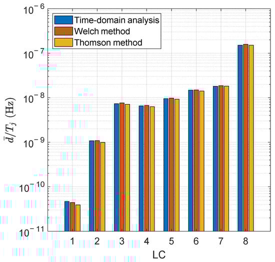 Again, a trade-off is required between effective bandwidth and relative standard uncertainty. The effective bandwidth can be estimated as (Hz). Furthermore, considering that the distribution of the estimator can be approximated by , the relative standard uncertainty was equal to . There is here much less arbitrariness than in Welch’s method, since, for a fixed observation time, , the only parameter to be chosen was the half-bandwidth , which influences both spectral resolution and relative standard uncertainty.