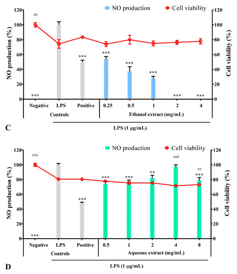 Pre-treatment with ethanol or ethyl acetate extracts significantly (p ≤ 0.001) inhibited NO production in a dose-dependent manner without significant effect on cell viability at all tested concentrations (Figure 3B,C). At 2 mg/mL, ethanol extract completely inhibited NO production, whereas ethyl acetate extract inhibited NO production to 31.38 ± 3.53%; both showed higher inhibitory activity than the positive control (49.83 ± 2.52% and 59.77 ± 2.67% NO production, respectively). Aqueous extract at all tested concentrations, except 4 mg/mL, significantly (p ≤ 0.01) inhibited NO production to the range between 74.02 ± 2.85% to 82.38 ± 3.40%. However, the inhibitory activity was lower than the positive control (47.77 ± 1.67% NO production; Figure 3D). Hexane extract inhibited NO production in a dose-dependent manner. At 8 mg/mL (37.90 ± 5.81% NO production), the inhibitory activity was comparable with the positive control (44.39 ± 1.25% NO production), but the cell viability was reduced by approximately 28.76% (Figure 3A).