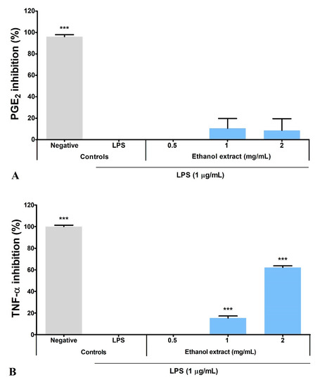 Meanwhile, BV2 microglia did not produce TNF-α and IL-6 (negative controls) under normal conditions. Overnight LPS stimulation (LPS control) induced TNF-α and IL-6 production to 7010 ± 88.32 and 12 912 ± 219.20 pg/mL, respectively. The LPS control was expressed as zero inhibition percentage, while the negative control was 100% inhibition. Ethanol extract significantly (p ≤ 0.001) inhibited the TNF-α and IL-6 production in a dose-dependent manner, with higher inhibitory activity on the IL-6 production (Figure 4B,C). Ethanol extract inhibited > 50% of IL-6 production (58.03 ± 0.54% inhibition) at 0.5 mg/mL, but a four-fold increase in concentration was needed to inhibit > 50% of TNF-α production (62.17 ± 1.55% inhibition). Nevertheless, ethanol extract at 2 mg/mL inhibited > 90% of IL-6 production (93.73 ± 1.00% inhibition).