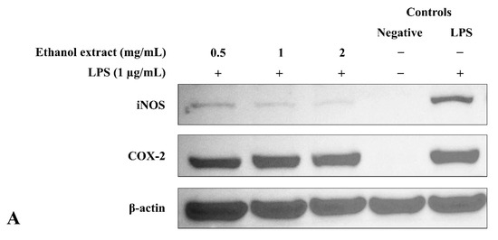 As shown in Figure 5, unstimulated BV2 microglia did not express iNOS and COX-2 (negative controls), whereas overnight LPS stimulation (LPS control) induced the expression of both proteins. Ethanol extract exhibited an opposite effect on the iNOS and COX-2 protein expression in a dose-dependent manner: significantly (p ≤ 0.01) inhibited iNOS expression but enhanced COX-2 expression (Figure 5B,C). In relation to the previous results (Figure 3C,E), the NO inhibitory activity of ethanol extract was achieved by downregulating iNOS protein expression.