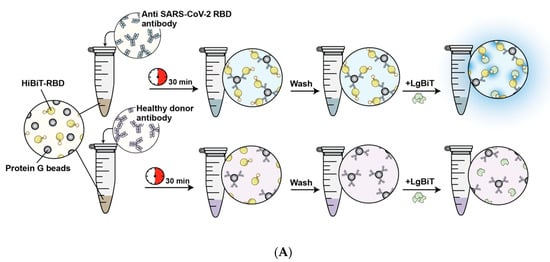 SARS-CoV-2 specific antibodies against RBD typically have a high affinity. We aimed to fuse RBD with the small portion (HiBiT) of the NanoBiT bioluminescence reporter system to detect RBD-binding antibodies. Adding a small tag (11-amino acid) instead of a large reporter protein ensures only a minor change in tertiary structure of RBD, maintaining the antibody binding affinity [,]. In this assay, the SARS-CoV-2 Spike RBD antibody binds to the HiBiT-RBD complex, and HiBiT binds to the larger section of the NanoBiT, the LgBiT. The high binding affinity of the two NanoBiT components leads to formation of the fully active enzyme, which digests its substrate rapidly to produce a strong bioluminescence signal (Figure 1A,B).