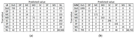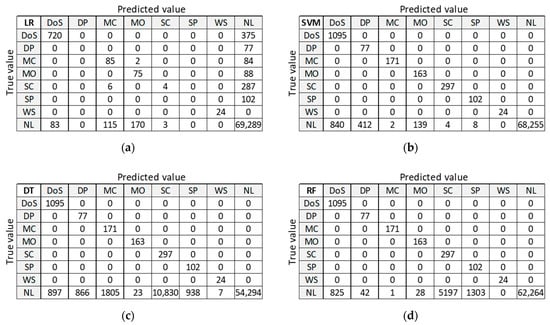 Figure 12 presents classification results for training dataset DR5 with the best accuracy on the test dataset. LR provides good classification of samples in the largest class ‘NL’, but misclassifies a large number of samples in anomalous classes (five out of seven classes). SVM, DT, and RF provide correct classifications for all anomalous classes, except for class DoS. ANN misclassifies a small number of samples in two anomalous classes and gives similar results in case of class ‘NL’.