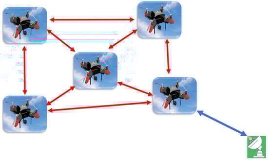 In [], the authors stated that a swarm communication architecture could be classified into two main architectures: an ad hoc network-based architecture and an infrastructure-based swarm architecture, as shown in Figure 1 and Figure 2.