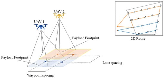 Therefore, according to the problem features, the main task can be divided into subtasks such as defining the order of area visits, calculating the shortest route that covers the set of polygonal areas, and distributing the mission among the UAVs. In addition, all UAVs take off at the same time from different locations. In remote-sensing applications, an important parameter to consider is the payload footprint. In multi-UAV systems, one strategy to ensure proper operation is that the UAVs are homogeneous and have the same payload; in addition, they should all fly at the same altitude, as shown in Figure 4.