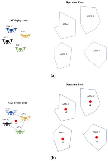 Thus, to determine the order in which each area is visited, a solution is proposed based on a simple TSP solution by using the centroids of each area as a city to visit and the centroid of UAV positions as deployment locations. The process is shown in Figure 5.