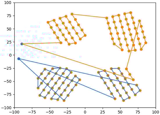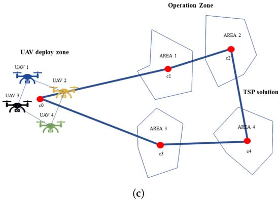 Figure 5a shows the areas and the UAV positions, each area’s centroids, and the centroid of UAV locations (Figure 5b). The solution of the TSP is found using the simulated annealing algorithm [], as shown in Figure 5c.