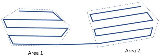 For this problem, it is assumed that the number of polygons to be covered is different from the number of UAVs; moreover, the areas of the polygons are different. It is assumed the back-and-forth (BF) pattern [] is the coverage route to simplify the path design.