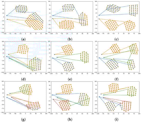 Results of the path-planning system for multiple UAVs and multiple areas: (a) two UAVs and two areas; (b) two UAVs and three areas; (c) two UAVs and four areas; (d) three UAVs and two areas; (e) three UAVs and three areas; (f) three UAVs and four areas; (g) four UAVs and two areas; (h) four UAVs and three areas; (i) four UAVs and four areas.