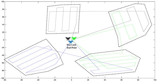 A complete simulation is performed assuming a mission scenario, as shown in Figure 9. The start and end points are the same at , and three drones are chosen to manage the swarm mission. In addition, the mission zones are drawn randomly in polygons, which, in this study, are four separate zones. Meanwhile, as shown in Figure 9, the colored routes are those generated by the algorithm, in which each color belongs to an individual drone.