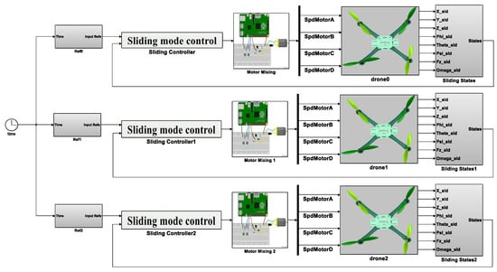 Advancing the swarm application, the MATLAB Simulink platform powered the simulation process to examine the controller’s functionality during the flight. Approaching the practical tests, some assumptions are considered during the simulation: the system solver is discrete with a fixed-step type of 0.001 s, the average cruise velocity is 5 m/s, and the flight altitude is up to 20 m, which needs a longer time in comparison to the variable-step mode with an ordinary differential equation (ODE) solver, but the results are much more accurate to the reality. To this end, Figure 10 shows the overall diagram of a swarm system consisting of three drones flying in distinct zones but with similar relative distances as practical tests. Once the decision-making system defines the waypoints, the reference values of the controller are desired, which are the position and heading angles. Secondly, the attitude desired values are generated, and finally, the motor mixing part interprets the commands for the motors (see [,,]).
