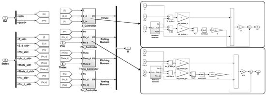 Furthermore, the sliding surface equation can be obtained as . Updating the error matrix and considering the state matrix as planar and vertical movements and rotations in the form of Euler angles, the control logic could be stated as given:
