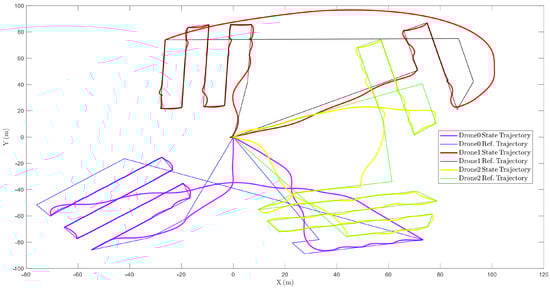 As shown in Figure 12, the drones follow the reference trajectories when the swarm decision-making system commands, which could even be dynamically changed during the mission. To this end, the controller algorithm is designed to face changing parameters, namely, the weight and the trajectory of the swarm. In addition, the time and distance data of the simulation are elaborated in Table 2. Comparing the results, the decision-making algorithm is functionally optimized so that the total time difference is less than 9 s among the UAVs, and the total trajectory distances are managed to obtain similar values.