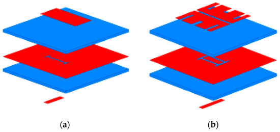 The proposed antenna element is shown in Figure 1, and comprises three parts. The first part is a patch radiator, which includes a pair of patches, two dielectric substrates (i.e., substrate 1 and substrate 2) characterized by a Rogers 4350B material (εr = 3.66, tan δ = 0.004), and a ground plane (i.e., ground 1) with a double-H slot fed through a microstrip line. The second part is a coplanar radiator, which includes four parasitic patches, a ground plane (i.e., ground 2) connected with the ground plane of the first part by means of metallic pin columns, and a dielectric substrate (i.e., substrate 3). The third part, filling the space between the two radiators, consists of air (or foam).