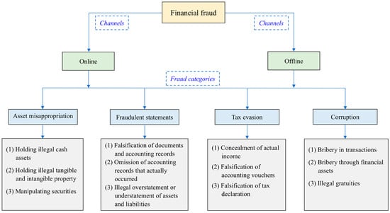 All types of financial fraud cannot be separated from the primary attributes of fraud which includes intent, objective, and motive []. The intent indicates that financial fraud is intentional. The objective includes deception, trickery, concealment, and evasion []. The motive is significant in fraudulent activities, including the financial motive and the non-financial motive []. Based on the fraud classification framework of the Association of Certified Fraud Examiners (ACFE), we design a fraud tree to analyze the fraud classification of listed internet companies in China []. First, the implementation channels of financial fraud can be divided into online channels and offline channels. Second, the fraud categories mainly include asset misappropriation, fraudulent statements, tax evasion, and corruption. It should be noted that no matter what type of financial fraud it is, it can happen through online or offline channels. For each fraud category, many sub-branches can be seen in Figure 1. Asset misappropriation mainly includes holding illegal cash assets, holding illegal tangible and intangible property, and manipulating securities. Fraudulent statements are a relatively common form of financial fraud, including falsification of documents and accounting records, omission of accounting records that occurred, and illegal overstatement or understatement of assets and liabilities. For tax evasion, the main types are concealment of actual income, falsification of accounting vouchers, and falsification of tax declaration. The last is corruption, which includes bribery in transactions, bribery through financial assets, and illegal gratuities.