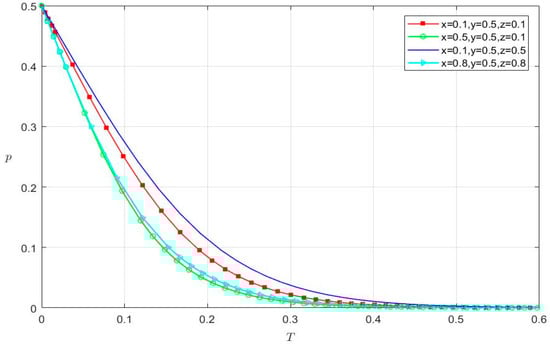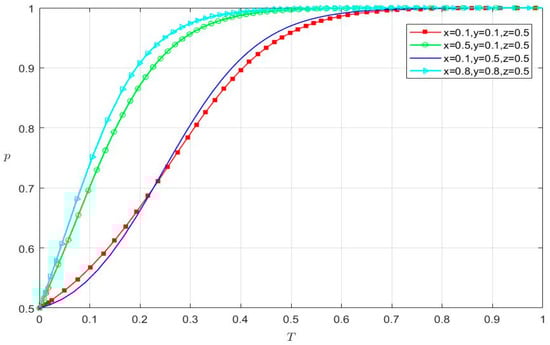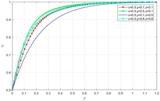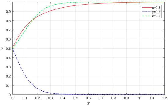 First, the initial probabilities of the three parties are set to 0.5, i.e., x = y = z = 0.5. The evolutionary process of three-party strategy selections is shown in Figure 2. The horizontal axis represents the evolution time (t) and the vertical axis shows the decision probability of different parties (p). As time passes, the evolution time (t) presents different characteristics. When a decision probability is less than 0.005 or larger than 0.995, it is assumed to be equal to 0 or 1.