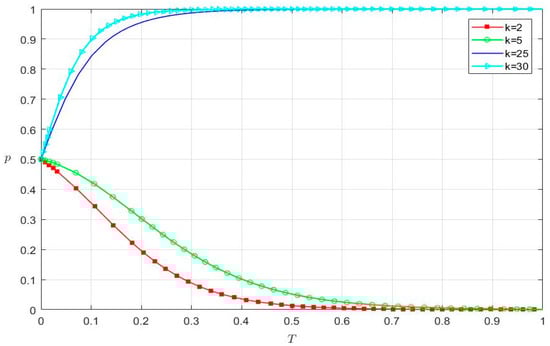 In Figure 4, the probability of financial fraud of listed internet companies converges to 0 or 1 under different values of k. When k = 2 and k = 5, the probability of financial fraud converges to 0. In this case, listed internet companies do not choose a financial fraud strategy for the smaller extra revenue. In addition, when k = 25 and k = 30, the probability of financial fraud converges to 1. Listed internet companies probably commit financial fraud to obtain the larger extra revenue. Thus, the extra revenue from financial fraud (k) is an important factor influencing the strategy selection of listed internet companies.