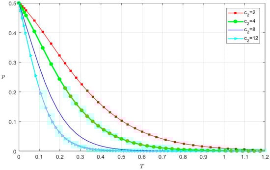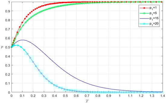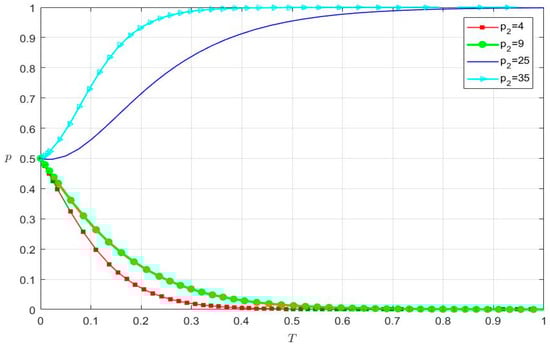 Figure 8 shows that accounting firms choose a loose audit strategy because of a small fine after loose audits found by audit regulators (such as p2 = 4 and p2 = 9), and the probability of accounting firms choosing a strict audit strategy approaches 0. However, accounting firms are inclined to choose a strict audit strategy with the increase in p2. When p2 increases from 25 to 35, the evolution time (t) is shortened from 0.8527 to 0.3627. Thus, a larger fine after loose audits found by audit regulators (p2) prompts accounting firms to choose a strict audit strategy. Otherwise, they make a loose audit strategy with a small p2. Comparing Figure 7 and Figure 8, it can be seen that the change in the strict audit cost (c2) does not change the strategy selection of accounting firms, but a larger fine after loose audits found by audit regulators (p2) prompts accounting firms to create a strict audit strategy.