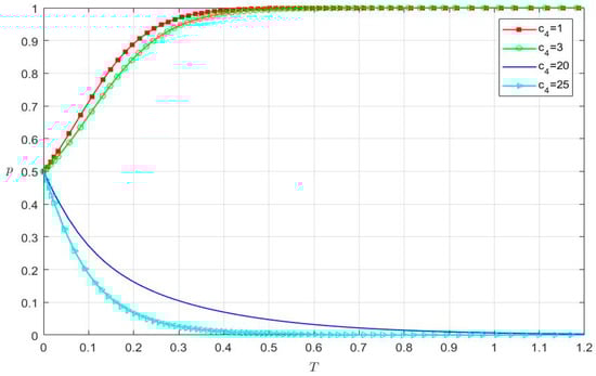 Keeping other parameters unchanged, we study the strategy selection of audit regulators under the impact of the active supervision cost (c4). When c4 is 1, 3, 20, and 25, respectively, the simulation results of the strategy selection of audit regulators are shown in Figure 10.